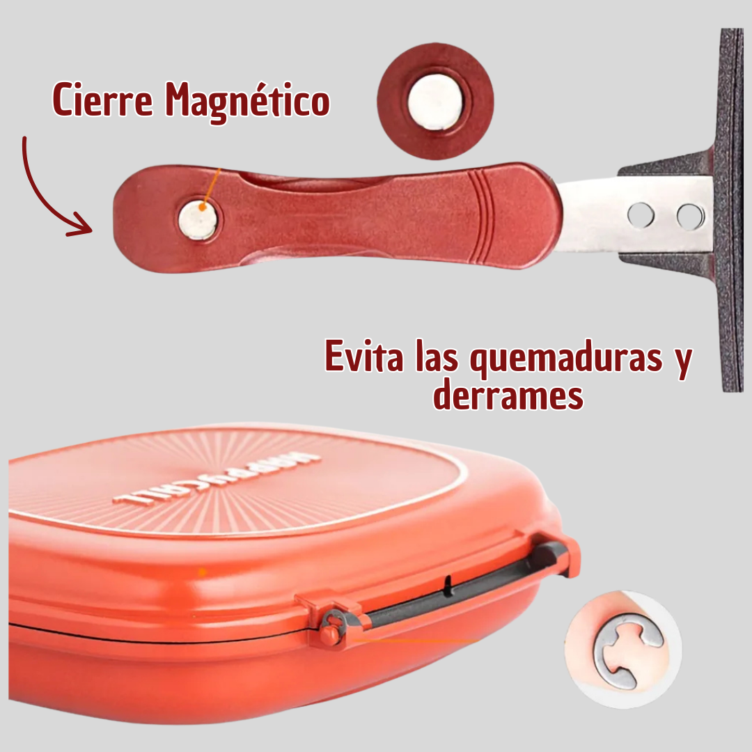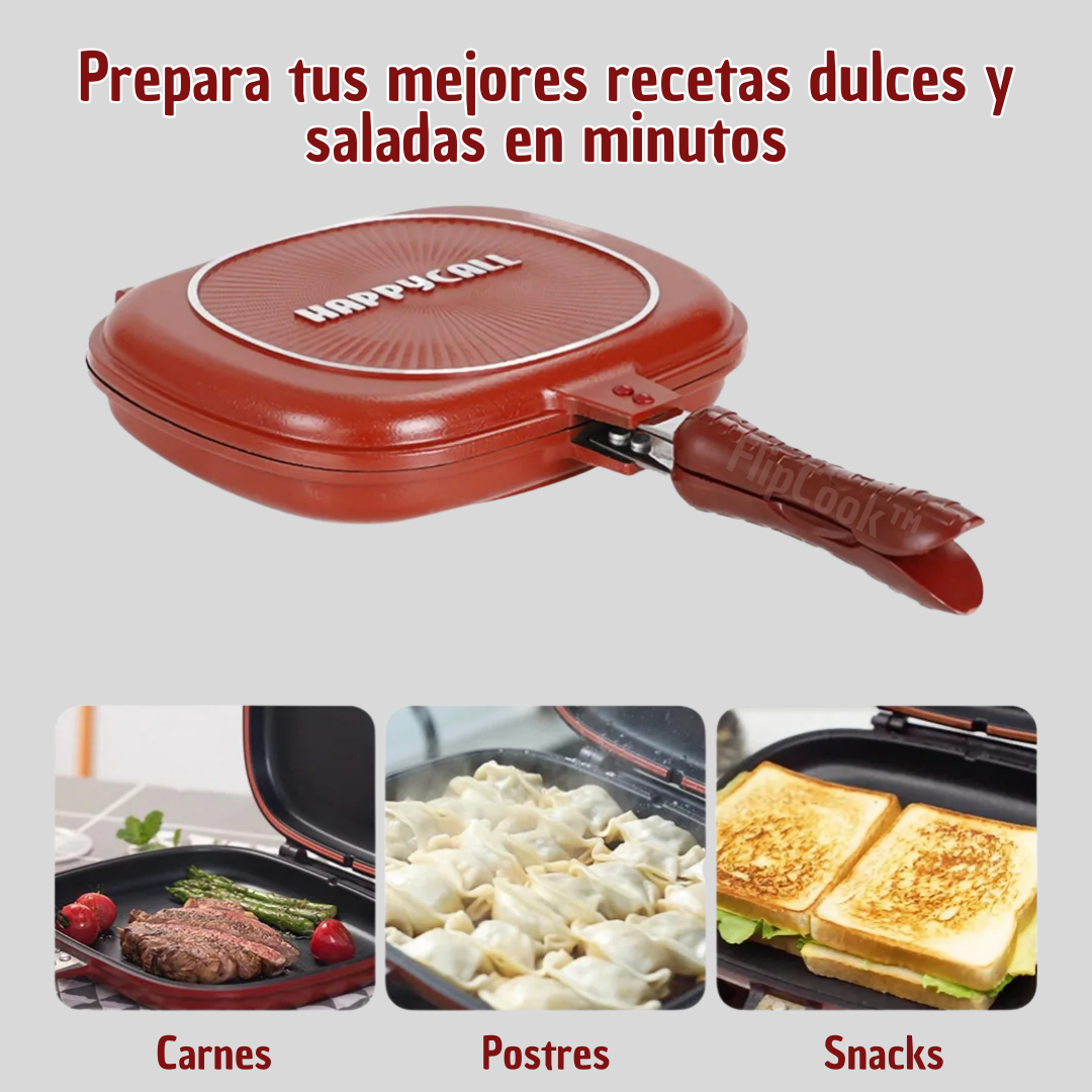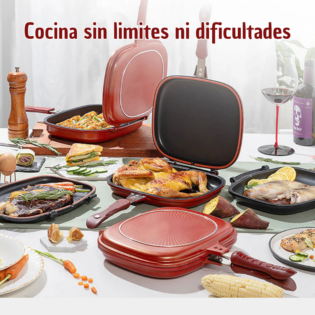 Olvídate de derrames y vueltas complicadas. Su diseño de doble cara te permite girar la sartén fácilmente para cocinar ambos lados de forma uniforme, sin utensilios adicionales ni riesgo de que la comida se desarme.