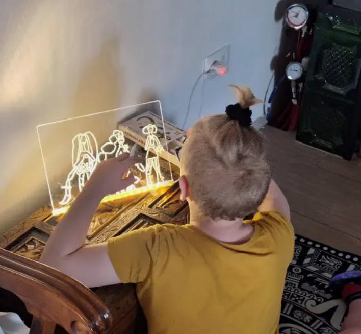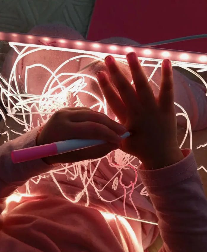 Permite a los niños dibujar con luz y crear obras únicas que desaparecen solas, fomentando la imaginación sin ensuciar ni desperdiciar papel.